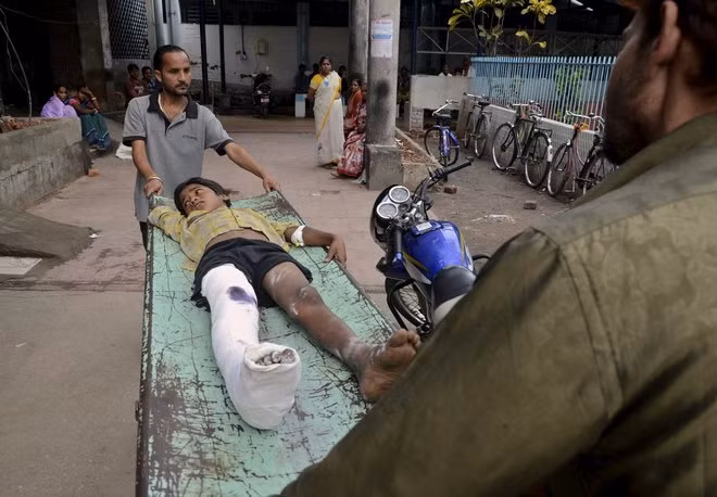Pakistan, Bangladesh và Ấn Độ cũng chịu ảnh hưởng của cơn địa chấn. Số người chết ở miền bắc Ấn Độ đã tăng lên 12 người. Trong ảnh, một cậu bé bị thương được đưa đến bệnh viện ở Siliguri, Ấn Độ. Ảnh: Reuters