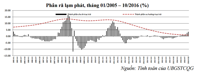 Phân rã lạm phát cũng cho thấy thành phần lạm phát dài hạn vẫn duy trì ở mức thấp nhờ các yếu tố cơ bản như tổng cầu (lạm phát cầu kéo) và chi phí sản xuất (lạm phát chi phí đẩy) ổn định; trong khi thành phần lạm phát có tính chu kỳ sau khi ngừng tăng trong tháng 6 và 7, đã tăng nhẹ trở lại trong tháng 8 và tiếp tục tăng khá mạnh trong tháng 9 và tháng 10 do chịu tác động của của tăng giá dịch vụ công (dịch vụ y tế, giáo dục đóng góp khoảng 70% vào tổng mức tăng chung kể từ đầu năm).