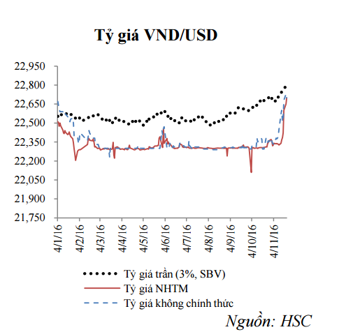Cơ quan này chỉ ra 2 nguyên nhân chính làm “nóng” tỷ giá. Cụ thể là: (i) USD liên tục lên giá so với các đồng tiền chủ chốt, đặc biệt sau khi có kết quả chính thức của bầu cử Tổng thống Mỹ; (ii) Nhu cầu ngoại tệ tăng trở lại theo yếu tố mùa vụ nhằm đáp ứng nhu cầu thanh toán về cuối năm (kim ngạch nhập khẩu hàng hóa đã chấm dứt xu hướng giảm so với năm trước) và đón đầu khả năng FED tăng lãi suất vào tháng 12.