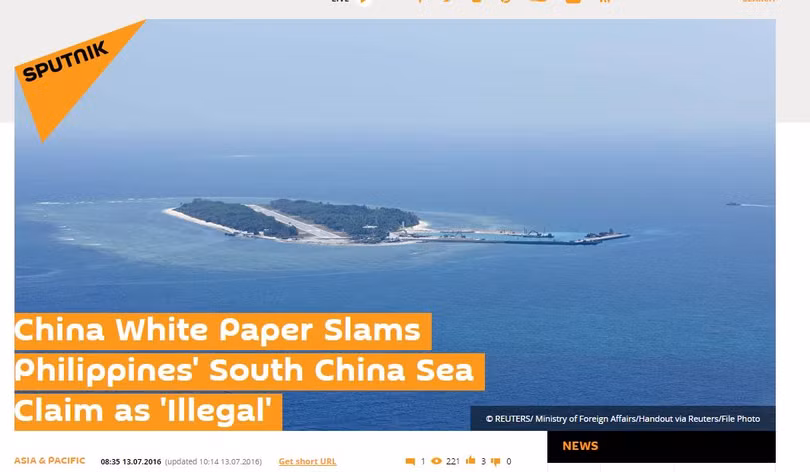 Trong các báo cáo mới nhất, Sputnik phiên bản tiếng Anh cũng đã phản ánh việc Trung Quốc phản đối, tuyên bố không chấp nhận hay thừa nhận phán quyết của tòa PCA cũng như việc Bắc Kinh ngày 13/7 đã ra Sắch Trắng đề cập đến các tranh chấp với Philippines, lặp lại tuyên bố đòi chủ quyền ở Biển Đông, ngang nhiên tuyên bố có quyền thiết lập Vùng nhận dạng phòng không trên vùng biển này.