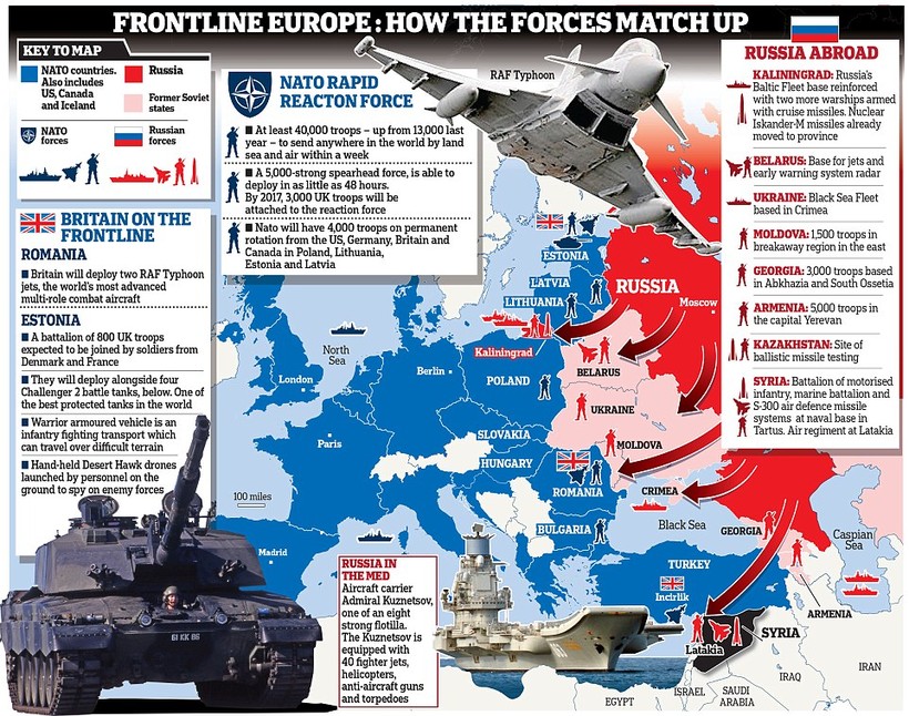 Những so sánh lực lượng quân sự của Nga với NATO đã phản ánh lợi thế lớn về số lượng của liên minh NATO về cả số lượng binh lính lẫn vũ khí trang bị. Tuy nhiên, không chắc là phần lớn các thành viên NATO sẽ tham chiến ở các nước Baltic hay Ukraine (nước không phải là thành viên NATO). Ngoài thách thức về vấn đề vận tải để đến được khu vực này, công chúng phương Tây có vẻ như cũng không mấy sẵn sàng tham chiến để bảo vệ các láng giềng Đông Âu theo như các cuộc khảo sát ý kiến người dân mới được tiến hành.