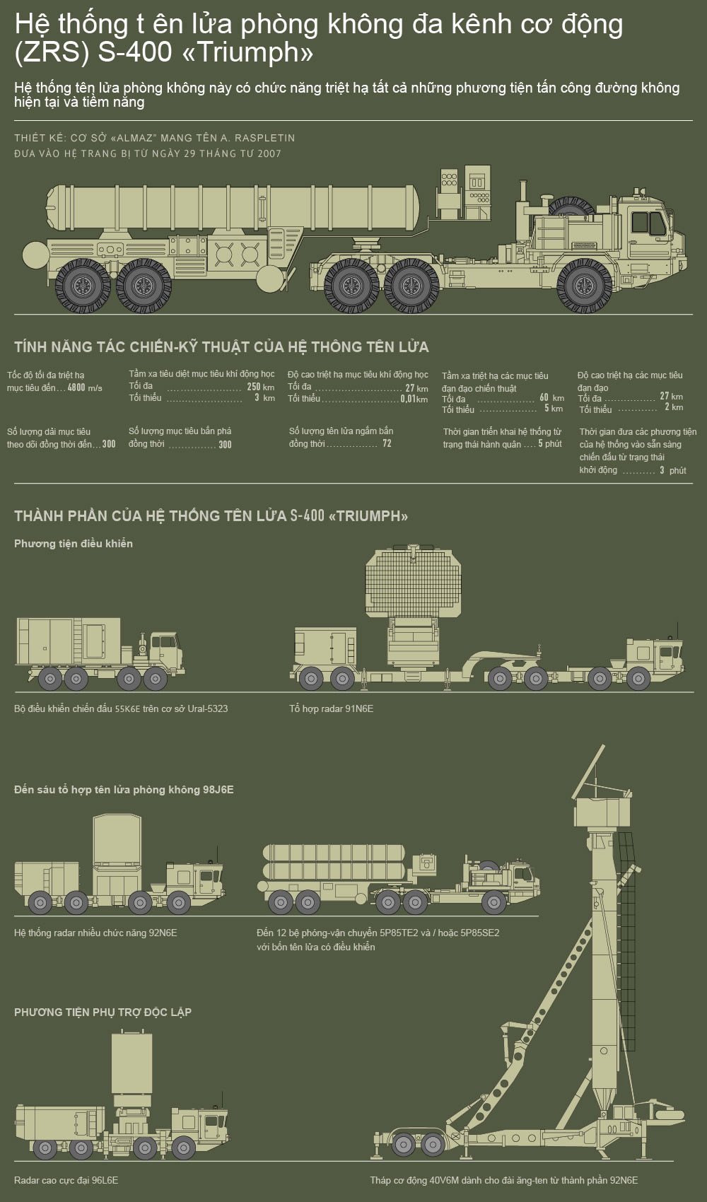 Hệ thống tên lửa phòng không S-400 "Triumph" phát triển và sản xuất bởi tập đoàn vũ khí phòng không PVO "Almaz-Antey", được thiết kế để bảo vệ các cơ sở chính trị-hành chính, kinh tế và quân sự quan trọng nhất chống lại các cuộc tập kích đường không, các loại tên lửa đạn đạo chiến lược chiến thuật, tên lửa hành trình và cả tên lửa đạn đạo tầm trung. Có khả năng chiến đấu trong điều kiện tác chiến điện tử của cả hai bên ở cấp độ cao.
