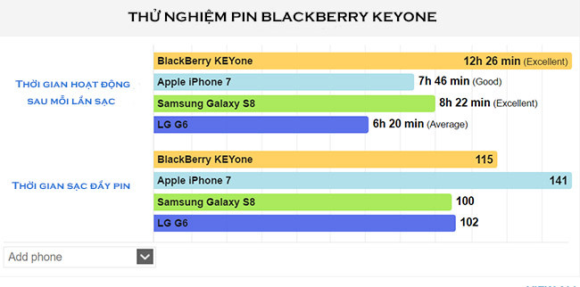 Một khía cạnh khác của thử nghiệm pin là thời gian sạc pin. Thử nghiệm cho thấy cần hơn 2 giờ để sạc đầy chiếc KEYone. Đây không phải là một tốc độ sạc rất nhanh, nhưng cũng không hề chậm. Nếu so sánh với những smartphone không có chức năng sạc nhanh như iPhone 7 thì KEYone vẫn nhanh hơn.