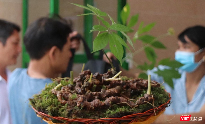 Ông Đinh Hồng Thắng (37 tuổi, người dân xã Trà Linh, huyện Nam Trà My, tỉnh Quảng Nam) đem cây sâm Ngọc Linh 20 năm tuổi đến hội chợ