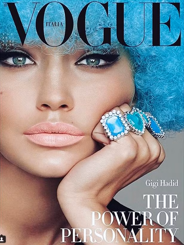 Hình ảnh này được sử dụng cho tạp chí Vogue Italia và cũng là một trong những shoot hình đáng nhớ của Gigi khi cô nàng được biến đổi thành một cô gái da màu rám nắng, cặp môi pastel tương phản mạnh mẽ với màu mắt và tóc.