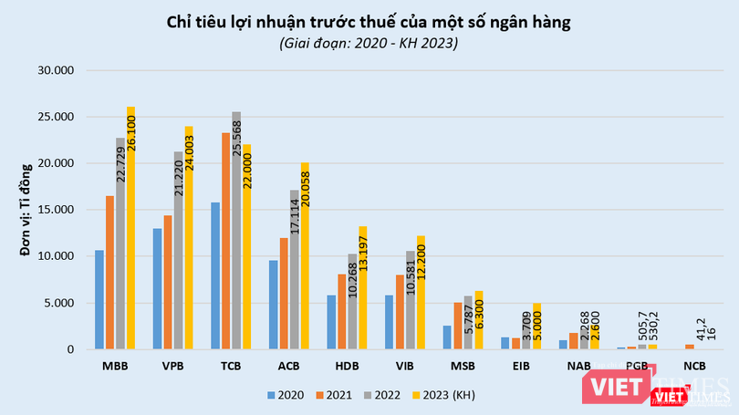 Nổi bật nhất là VPBank, với mục tiêu tín dụng đạt 636.000 tỉ đồng (tăng 33% so với cùng kỳ) và lợi nhuận trước thuế năm 2023 đạt 24.000 tỉ đồng (tăng 13% so với cùng kỳ hoặc tăng 53% nếu loại trừ khoản thu nhập bất thường từ phí trả trước bảo hiểm trong năm 2022).