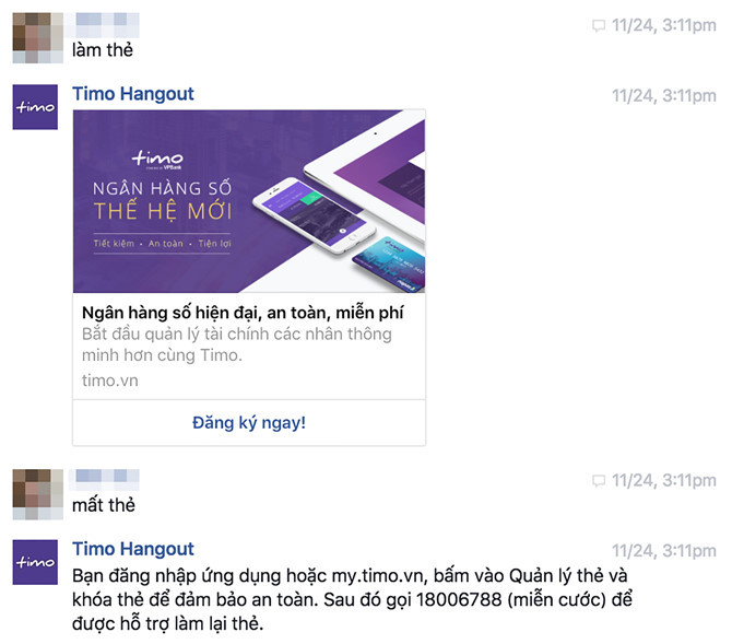 Timo Chat Bot là hệ thống tự động thay thế công việc cơ bản của nhân viên tư vấn trả lời những câu hỏi hằng ngày lặp đi, lặp lại của khách hàng. Được phát triển trên nền trả lời tự động của Facebook Messenger, Timo Chat Bot tự động bắt từ khoá và trả lời các câu hỏi của người dùng trong từng ngữ cảnh. Những thắc mắc cơ bản như làm thẻ, báo mất thẻ, chuyển tiền... sẽ được trả lời tự động chỉ với 1 tin nhắn hỏi đơn giản.