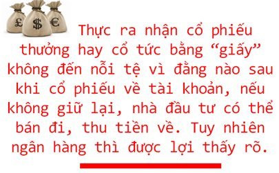 Mối quan tâm hàng đầu của cổ đông ngân hàng hiện nay là cổ tức. Hầu hết các ngân hàng chia cổ tức bằng cổ phiếu. Hãn hữu mới có ngân hàng chia cổ tức tiền mặt, mà tỷ lệ cũng thấp. Lý do là tổ chức tín dụng nào cũng muốn tăng vốn điều lệ, tăng vốn chủ sở hữu. Cho nên chia cổ phiếu thưởng, trả cổ tức bằng cổ phiếu từ nguồn vốn thặng dư, từ lợi nhuận để lại là gọn nhất. Tóm lại mùa đại hội năm nay, cổ đông ngân hàng nhận “giấy”, không được nhận tiền mặt.