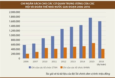 Theo Dự toán chi ngân sách trung ương năm 2016, tổng chi cho các cơ quan trung ương của sáu tổ chức chính trị - xã hội tới 1.503,740 tỉ đồng, gồm Ủy ban Trung ương Mặt trận tổ quốc Việt Nam (92,435 tỉ đồng); Trung ương Đoàn Thanh niên Cộng sản Hồ Chí Minh (551,505 tỉ đồng); Trung ương Hội Liên hiệp Phụ nữ Việt Nam (158,685 tỉ đồng); Hội Nông dân Việt Nam (346,515 tỉ đồng); Hội Cựu chiến binh Việt Nam (80,830 tỉ đồng); Tổng liên đoàn Lao động Việt Nam (273,770 tỉ đồng). Nếu tính luôn cả dự toán ngân sách cho Liên minh Hợp tác xã Việt Nam thì tổng chi lên đến 1.615,710 tỉ đồng.