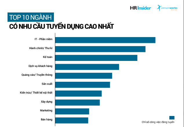Ngành IT đứng đầu nhu cầu tuyển dụng cao nhất trong quý, các ngành tiếp theo có nhu cầu tuyển dụng cao bao gồm: Hành chính/Thư ký – Kế toán – Dịch vụ Khách hàng – Quảng cáo/Truyền thông – Sản xuất – Kiến trúc/Thiết kế nội thất – Xây dựng – Marketing (Tiếp thị) – Sales (Bán hàng).