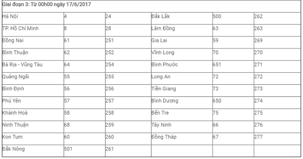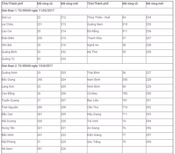 Theo lộ trình chuyển đổi mã vùng điện thoại cố định đã được công bố, việc chuyển đổi mã vùng điện thoại cố định tại 59 Tỉnh/Thành phố như sau: