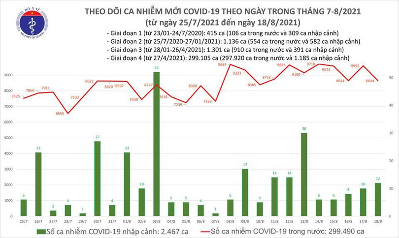 Cụ thể, tính từ 18h ngày 17/8 đến 18h30 ngày 18/8, trên Hệ thống Quốc gia quản lý ca bệnh COVID-19 ghi nhận 8.656 ca nhiễm mới, trong đó 12 ca nhập cảnh và 8.644 ca ghi nhận trong nước, giảm 951 ca so với hôm qua. Có tới 5.825 ca lây nhiễm trong cộng đồng.