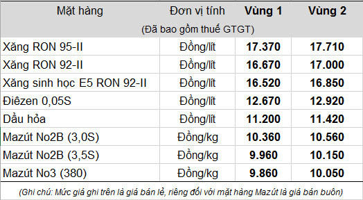 Đến 19h, Tập đoàn Xăng dầu Việt Nam (Petrolimex) đã áp dụng giá bán lẻ mỗi lít xăng RON 92 là 16.670 đồng, các mặt hàng khác có biến động cụ thể như sau: