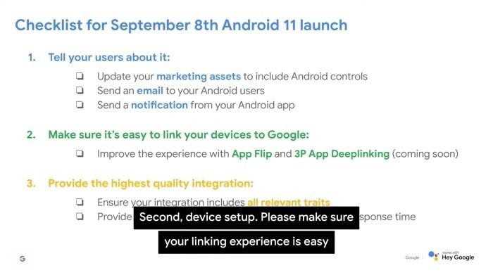 Nhưng điều đáng chú ý hơn cả là trong phần tổng kết lại của sự kiện trực tuyến vừa qua, Google đã trình chiếu một slide ghi ngày ra mắt Android 11 là 8/9. Đó cụ thể là danh sách công việc các nhà cung cấp cần kiểm tra để có thể sẵn sàng ra mắt chức năng điều khiển nhà thông minh vào ngày 8/9.