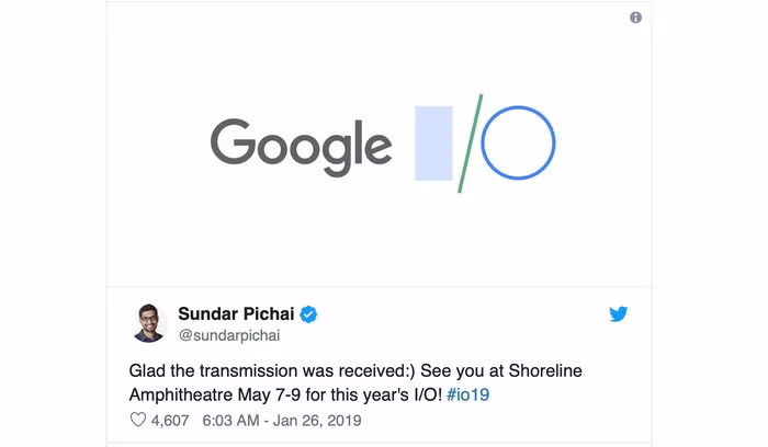 CEO Google đăng thông tin về thời gian diễn ra sự kiện I/O 2019 trên Twitter.