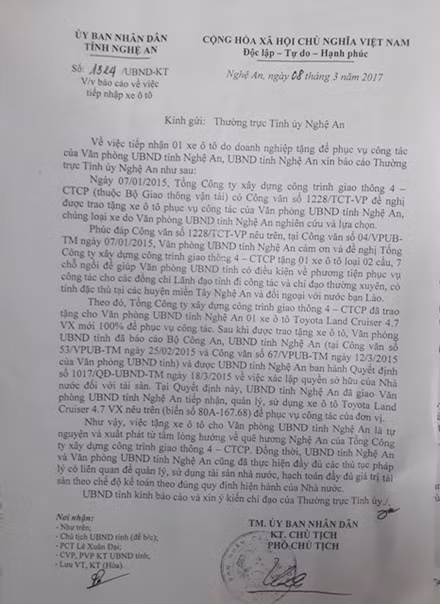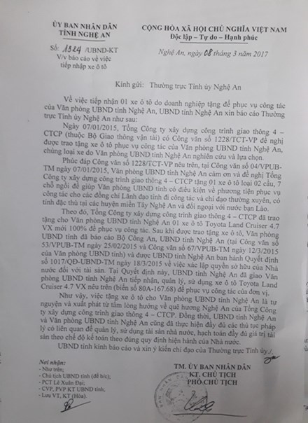 Theo báo cáo, ngày 7/1/2015, Tổng Cty Xây dựng công trình giao thông 4 (Cienco4) có công văn đề nghị được tặng xe ôtô phục vụ công tác của Văn phòng UBND tỉnh Nghệ An, chủng loại xe do Văn phòng UBND tỉnh Nghệ An lựa chọn.