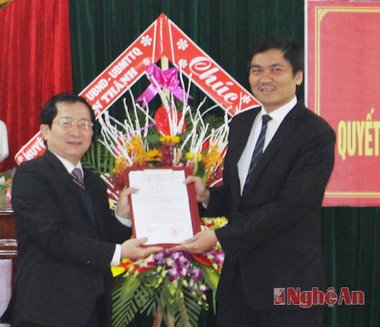Lãnh đạo tỉnh Nghệ An trao quyết định phân công ông Hoàng Nghĩa Hiếu (phải) làm Phó giám đốc Sở NN & PTNT Nghệ An. Ảnh Báo Nghệ An