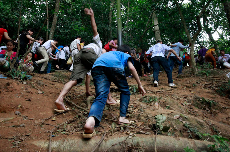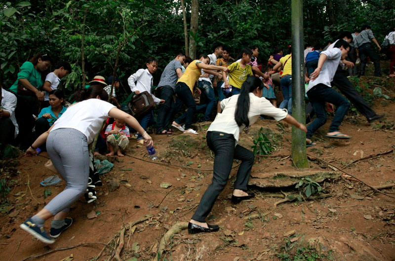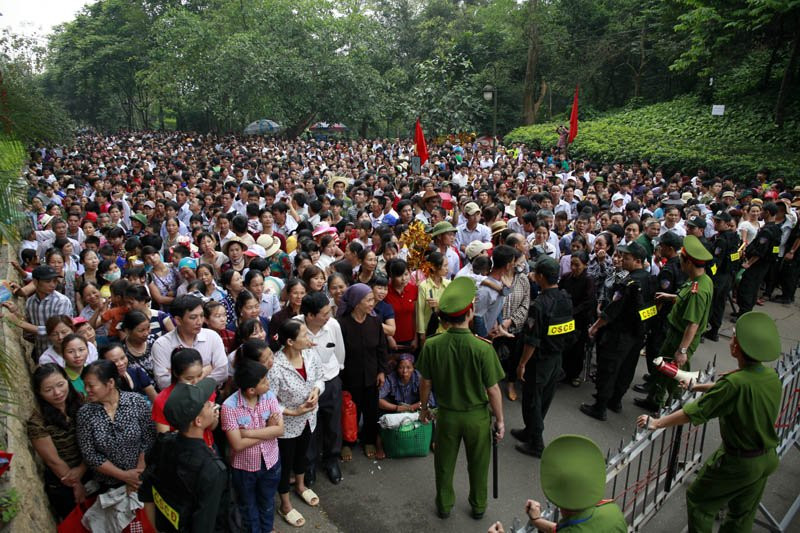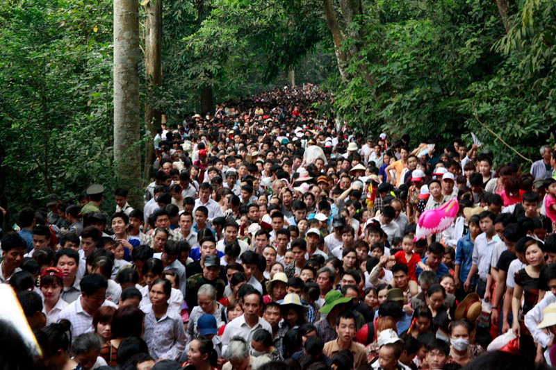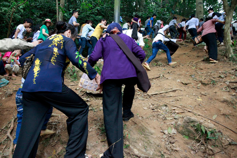 Trong cái năng oi bức đầu mùa, dòng người hành hương vẫn chen chân lên đền Thượng hành lễ, trong số đó có không ít trẻ nhỏ được bố mẹ đưa đi đã khóc thét trong cái không khí đặc quánh đến nghẹt thở vì lượng người ngày cành đông. Nhiều ông bố, bà mẹ với đứa con trên tay, trên cổ cùng vẻ mặt thất thần mệt mỏi…