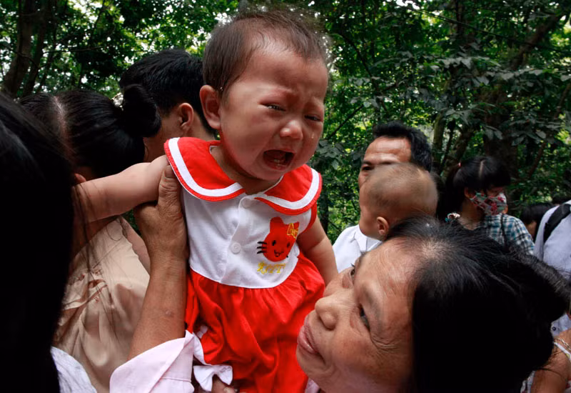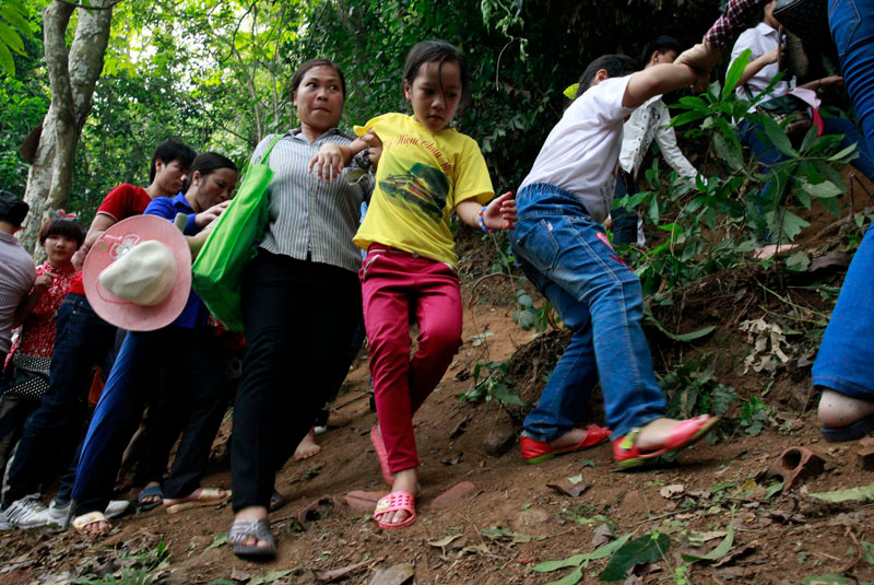Những đứa trẻ mệt mỏi, bơ phờ khi theo gia đình hành hương về đất Tổ.