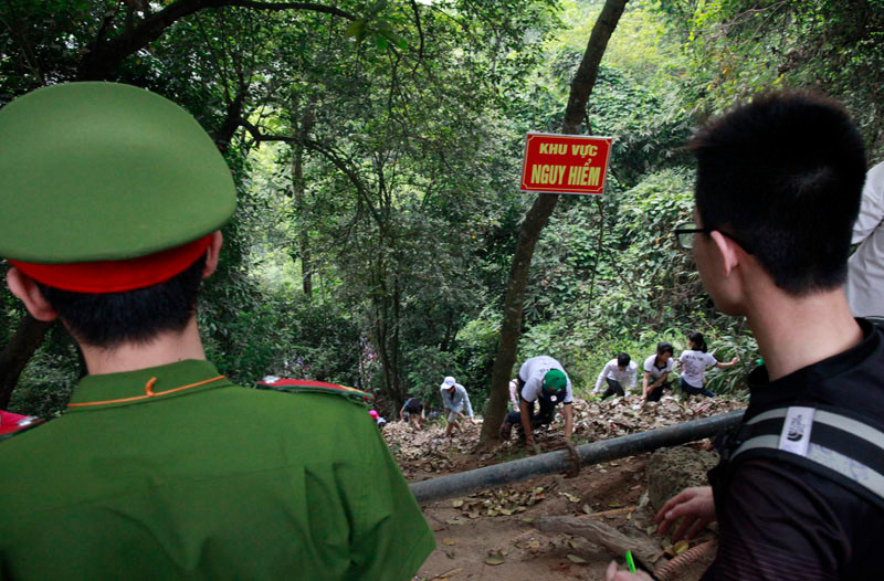 Lực lượng an ninh bất lực nhìn dòng người leo núi ở khu vực dù đã được cảnh báo là nguy hiểm.