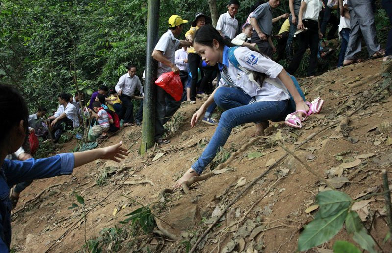 Ban tổ chức năm nay đã căng dây, đặt các biển cảnh báo nguy hiểm nhưng càng về trưa, lượng người lên núi Nghĩa Linh lễ Tổ bằng “đường rừng” ngày càng đông.