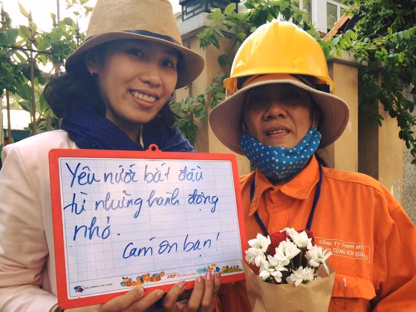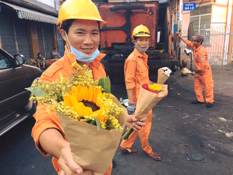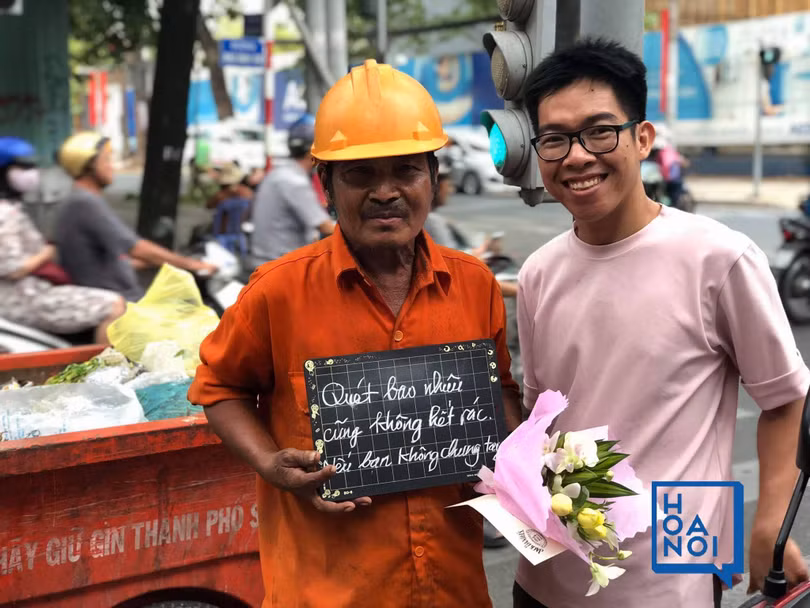 Tuy mệt mỏi và có phần chán nản vì những người dân thiếu ý thức, nhưng ngay khi được các bạn trẻ của một shop hoa mang tới tặng những bó hoa tươi thắm, thay lời cảm ơn, tri ân tới những người đang trực tiếp dọn dẹp nhiều ngàn tấn rác mỗi ngày, các cô chú công nhân VSMT liền vui vẻ nhận lời tham gia kêu gọi cộng đồng nói không với rác.
