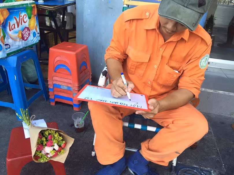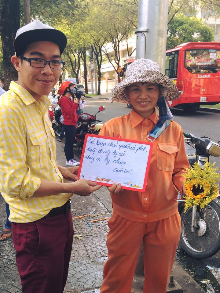 Những câu ngắn gọn được chính tay các công nhân VSMT dùng bút viết lên những tấm bảng, nhằm kêu gọi cộng đồng chú ý và chung tay: “Lễ 30/4, 1/5 hãy dọn rác ngay sau khi đi chơi! Cảm ơn!”, “Đừng xin thêm túi ni lon khi không cần thiết”, “Ở ngã tư, xin đừng nhận tờ rơi nếu bạn vứt ngay xuống đường”, “Bạn không ăn được túi nilon, cá cũng vậy”, “Ở đại dương không có chúng tôi, xin đừng xả rác”, “Các bạn chủ quán cà phê, hãy dùng ly sứ thay vì ly nhựa! Xin cảm ơn!”, “Bất chấp nguy hiểm, tôi vẫn quét dọn đường phố xuyên đêm! Hãy chung tay giúp tôi!”, “Mùa mưa, nếu không muốn ngập, đừng vứt rác xuống phố bạn nhé!”, “Quét bao nhiêu cũng không hết rác nếu bạn không chung tay”…