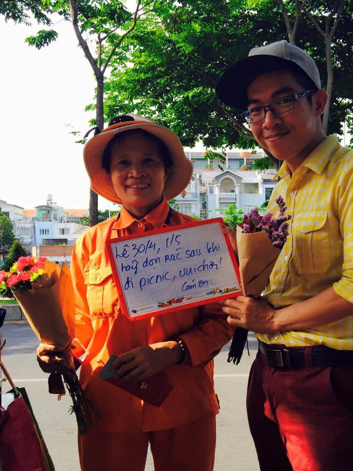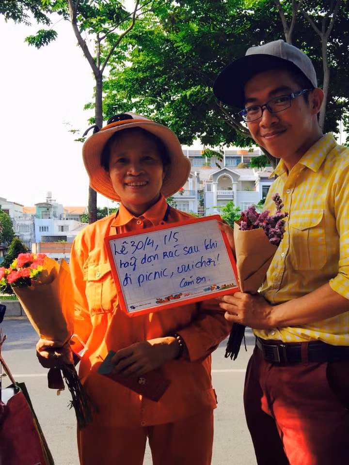 “Khi xếp hành lý cho kỳ nghỉ dài ngày, đừng quên mang theo bịch đựng rác phòng khi đi trekking, đi biển không có chỗ vứt nhé. Nhớ dặn con cháu, hội chị em bạn dì đừng xả rác nha. Nhậu trên bãi biển, đi picnic thì nhớ dọn trước khi về. Hoa Nói thay mặt các cô chú CNVS cảm ơn các bạn nhiều. Đi chơi văn minh, lành mạnh nha” – Các bạn trẻ xuất hiện trên phố, kêu gọi cộng đồng nâng cao ý thức, cùng đưa thông điệp chung tay vì VSMT xanh, sạch, vì cuộc sống lành mạnh.