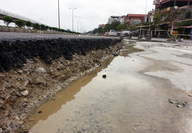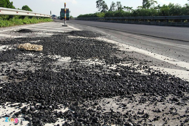 Trên cao tốc Pháp Vân - Cầu Giẽ, đơn vị thi công để nhựa đường vãi khắp nơi, nhiều đoạn đọng nước sau khi mưa. Ảnh: Hoàn Nguyễn