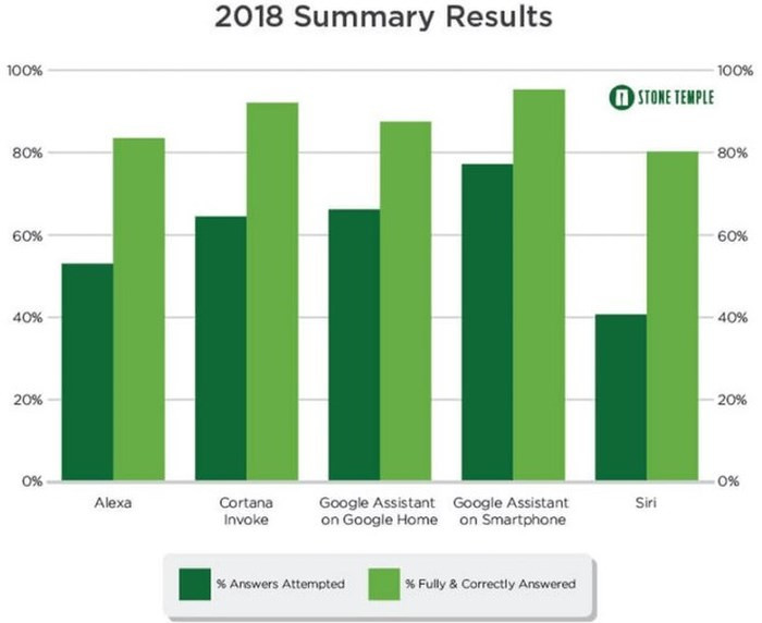 Theo Digitaltrends , số lượng câu hỏi mà Stone Temple thử thách các trợ lý ảo lên tới hơn 5000 câu xoay quanh nhiều chủ đề như động vật, thời trang, tài chính, du lịch, âm nhạc,…