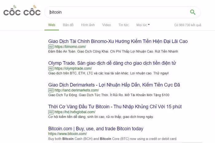 Ngoài ra, Binomo cũng chi tiền mua từ khóa rất mạnh tay. Trên công cụ tìm kiếm của trình duyệt Cốc Cốc, các từ khóa liên quan đến tiền kỹ thuật số, chứng khoán, hối đoái, ngoại tệ đều dẫn về trang Binomo.