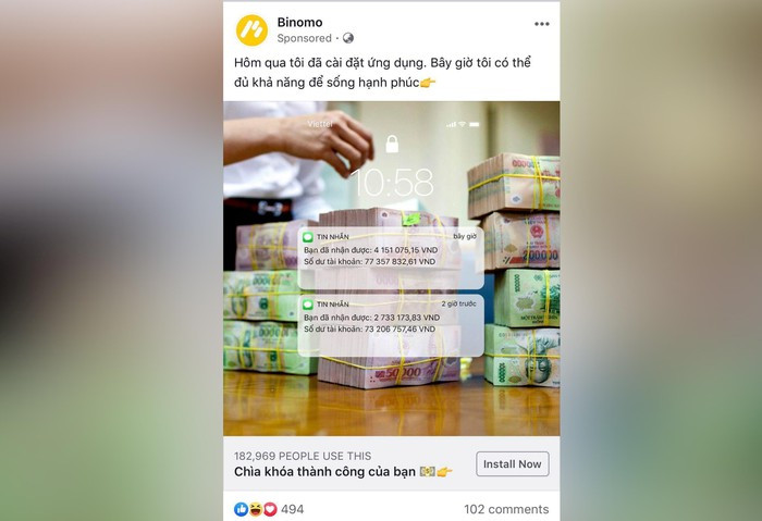Vẽ ra lợi nhuận khủng, phủ sóng trên nhiều nền tảng mạng xã hội, tạo uy tín bằng cách thuê người nổi tiếng, làm tin giả là công thức tiếp cận "con mồi" của ứng dụng cá cược Binomo. Hiện quảng cáo của Binomo vẫn liên tục xuất hiện trên Facebook, Google, Instagram và Cốc Cốc.