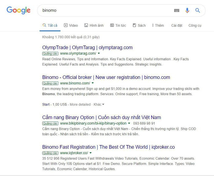 Tình trạng mua từ khóa cũng xuất hiện trên Google Search. Ngoài Binomo, các ứng dụng mô hình cá cược tương tự như Olymptrade, Bikibinary, Iqbroker... cũng mua từ khóa trên Google.