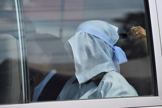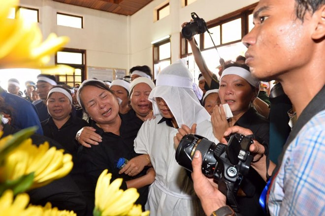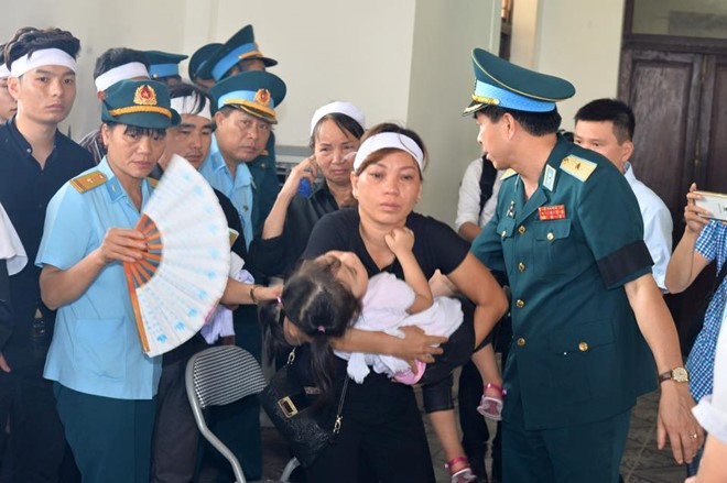 Gia quyến phi công Trần Quang Khải trong lễ truy điệu. Bé Khánh Vân (3 tuổi), con anh Khải thiếp đi trong vòng tay người thân.