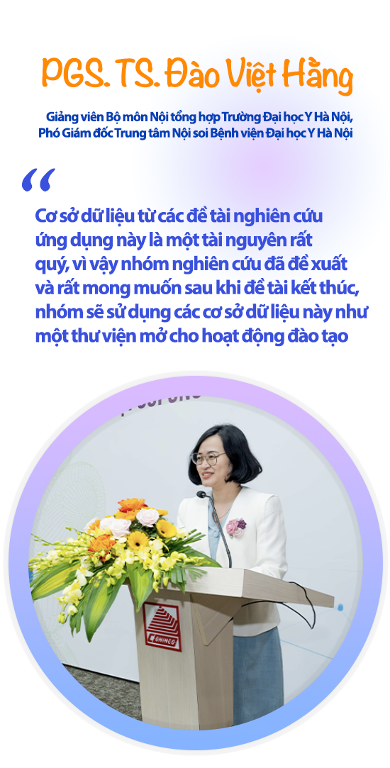 Đặc biệt, khi thực hiện đề tài ứng dụng AI trong nội soi tiêu hóa tại Việt Nam, PGS.TS. Đào Việt Hằng đã mời các chuyên gia nội soi tiêu hóa tại các bệnh viện lớn gán nhãn, khoanh vùng ảnh rất cẩn thận, tỉ mỉ và đã xây dựng được một bộ cơ sở dữ liệu nội soi rất quý, với số lượng rất nhiều và rất đa dạng. Điều này mang lại lợi ích cho cả bác sĩ lẫn người bệnh, giúp cho việc chăm sóc và điều trị bệnh nhân hiệu quả hơn.