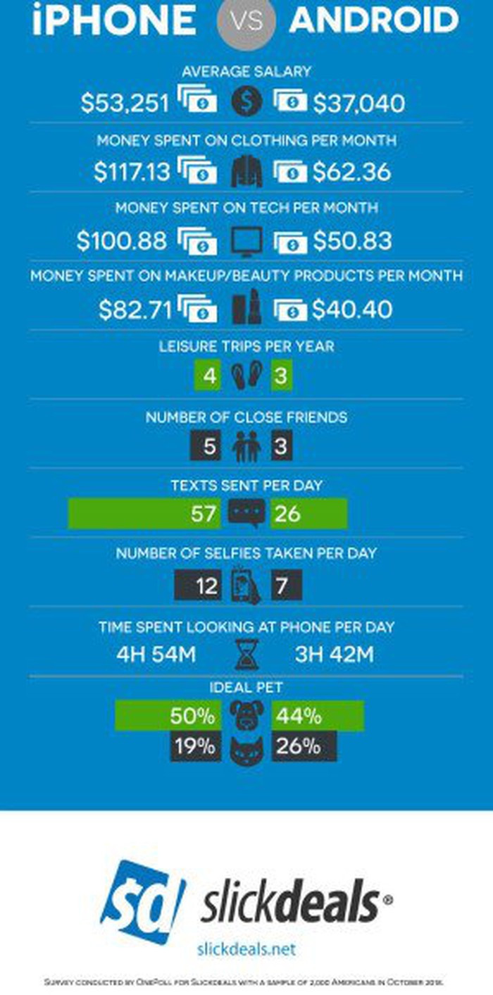 Theo khảo sát mới nhất của Slickdeals dựa trên 1.000 chủ sở hữu iPhone và 1.000 chủ sở hữu Android, thì người dùng iPhone nói chung vui vẻ, hướng ngoại, mạo hiểm và kiếm nhiều tiền hơn.