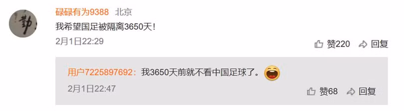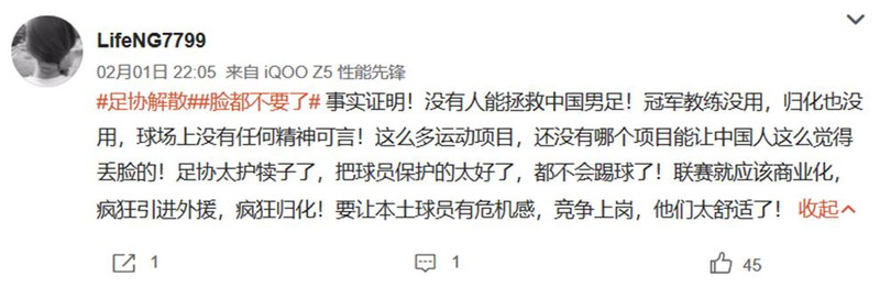 Một người dùng khác có nick là LifeNG7799 thẳng thắn chỉ ra rằng: “Sự thật đã chứng minh không ai có thể cứu được đội tuyển bóng đá nam Trung Quốc. Huấn luyện viên vô dụng, cầu thủ nhập tịch vô dụng, không thể hiện tinh thần thi đấu máu lửa trên sân. Với rất nhiều môn thể thao, không có môn nào có thể khiến người Trung Quốc cảm thấy xấu hổ như vậy. Hiệp hội bóng đá Trung Quốc đã quá o bế các CLB và cầu thủ đến nỗi họ không thèm chơi bóng nữa. Giải đấu đã bị thương mại hóa và nhập tịch cầu thủ điên cuồng khiến cầu thủ bản địa cảm thấy khủng hoảng…”