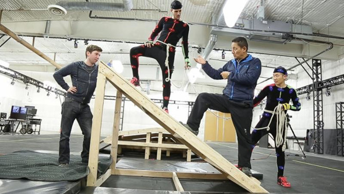 Đoàn làm phim đang mô phỏng động tác leo núi phù hợp.