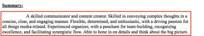 "Sau một lúc, các bản tóm tắt dường như hóa thành một chương dài trong một cuốn sách", Nicolai nói. "Sẽ tốt hơn nếu liệt kê một vài đầu dòng với những thành tích nổi bật và một câu chốt đậm tính thương hiệu, ‘Được biết đến với việc đạt được XYZ'".