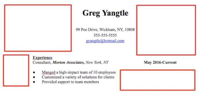 "Những người xin việc thường xuyên sử dụng quá nhiều hoặc quá ít ‘khoảng trắng'", Nicolai nói. "Nhồi nhét quá nhiều từ trên một trang giấy với lề nhỏ và phông chữ nhỏ sẽ gây rối rắm. Và, ngược lại, có quá nhiều 'khoảng trắng' với các từ xếp thẳng hàng về phía này hoặc phía kia của lý lịch công việc cũng gây khó chịu tương tự".