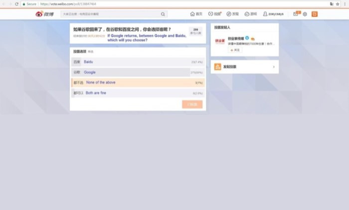 Ngoài ra, một cuộc khảo sát trên Weibo với câu hỏi nếu Google quay lại, bạn sẽ chọn Google hay Baidu. Rất bất ngờ khi gần 90% câu trả lời chọn Google và chỉ 7% chọn Baidu, số còn lại chọn hoặc không chọn cả hai.