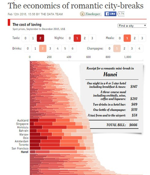 Trang tin Economist.com đã công bố bảng xếp hạng "chi phí tình yêu" tại hơn 100 thành phố trên thế giới, trong đó có Hà Nội và TP HCM