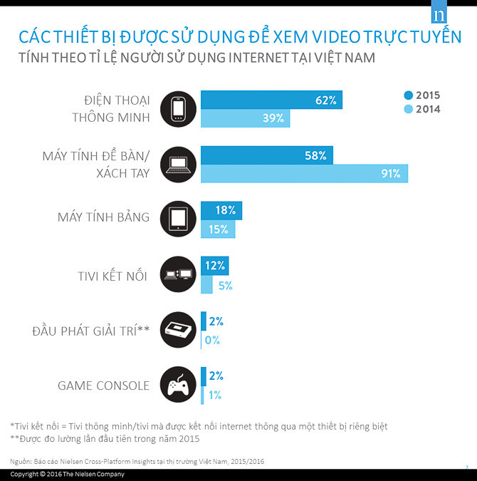Gần 58% người sử dụng Internet tại Việt Nam vẫn tiếp tục xem video trực tuyến trên máy tính để bàn và laptop. Tuy nhiên, tỉ lệ này đã sụt giảm mạnh qua từng năm, từ 91% năm 2014 xuống còn 58% trong năm 2015.
