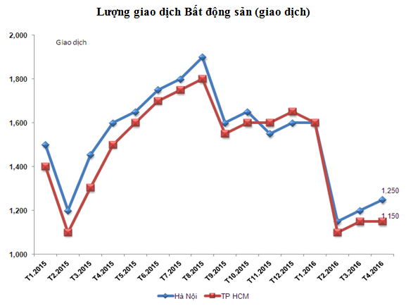 Hiệp hội BĐS Việt Nam vừa có báo cáo thị trường BĐS tháng 4/2016. Theo đó, lượng giao dịch đã có sự tăng đáng kể so với tháng trước đó, giá tại nhiều dự án có tiến độ, hạ tầng tốt tăng nhẹ.