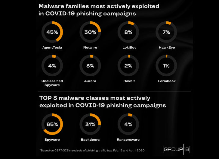 Tin giả (fake news) là chiêu thức ưu tiên của tội phạm mạng để lừa số đông nạn nhân mắc bẫy. Theo công bố của Group-IB ghi nhận từ ngày 13/2 đến 1/4, hầu hết lượng email lừa đảo (phishing) đính kèm các loại mã độc lần lượt AgentTesla (45%), NetWire (30%), LokiBot (8%) và HawkEye (7%) nhằm đánh cắp thông tin tài chính và dữ liệu cá nhân, thuộc ba nhóm chính gồm: spyware (65%), loại tạo cửa sau để thâm nhập máy tính backdoor (31%), và loại mã hóa dữ liệu tống tiền nạn nhân Ransomware (4%).