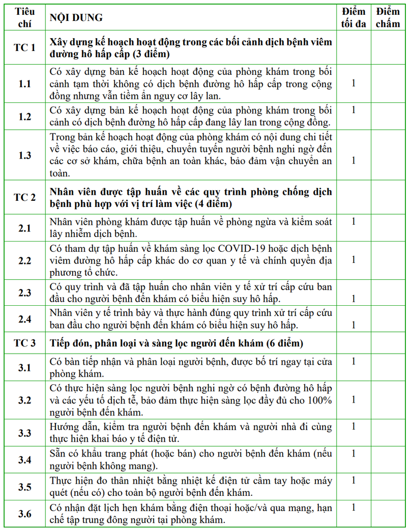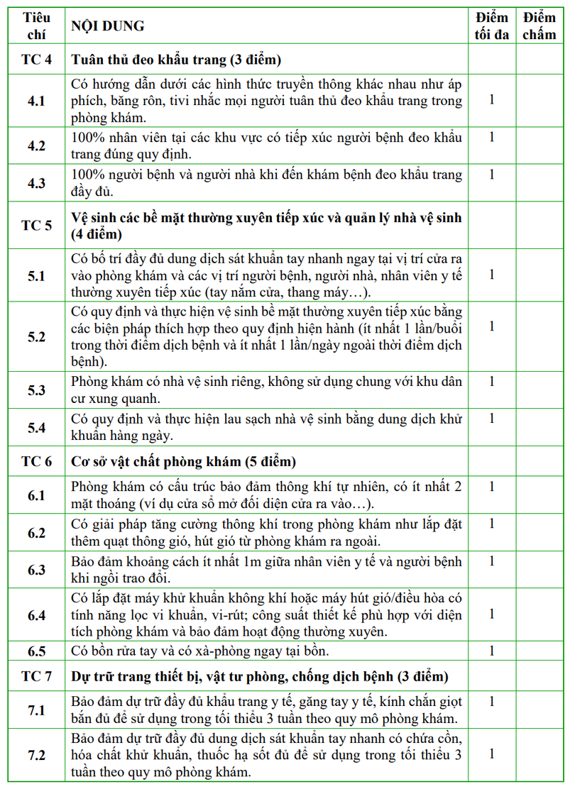 Mỗi tiêu chí đạt yêu cầu sẽ được tính 1 điểm, tổng điểm tối đa là 30. Phòng khám an toàn có tổng điểm đạt từ 25 - 30 điểm, phòng khám an toàn ở mức thấp có tổng điểm đạt từ 20 - 24 điểm, phòng khám không an toàn có tổng điểm dưới 20 điểm.