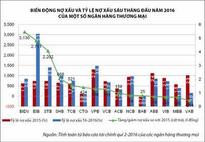 Theo thống kê từ 15 ngân hàng thương mại đã công bố báo cáo tài chính quý 2-2016 (gồm chín ngân hàng niêm yết và VIB, VPBank, Techcombank, BacABank, ABB, VietABank), tổng nợ xấu của các ngân hàng này đã tăng 10.420 tỉ đồng so với đầu năm, tỷ lệ nợ xấu tăng từ 1,6% lên 1,83%. Trong đó, 11/15 ngân hàng có nợ xấu tăng, đứng đầu là BIDV, Eximbank, Sacombank, SHB. 7/15 ngân hàng có tỷ lệ nợ xấu giảm so với đầu năm, tuy nhiên nhiều ngân hàng có tỷ lệ nợ xấu giảm là do tín dụng tăng mạnh hơn tốc độ tăng của nợ xấu (Vietcombank, VietinBank, ACB).