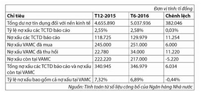 Với dư nợ tín dụng của nền kinh tế là 5,04 triệu tỉ đồng vào cuối tháng 6-2016 và 4,66 triệu tỉ đồng vào cuối năm 2015, có thể tính được nợ xấu do các tổ chức tín dụng (TCTD) báo cáo đã tăng 11.254 tỉ đồng trong sáu tháng đầu năm nay, tương ứng tốc độ tăng là 9,5%. Cùng kỳ, tốc độ tăng của tín dụng chỉ là 8,2%. Nếu tính luôn nợ xấu đang “tồn kho” tại Công ty Quản lý tài sản của các TCTD Việt Nam - VAMC (khoảng 217.000 tỉ đồng), tỷ lệ nợ xấu đang ở mức 6,89%, giảm 0,44% so với cuối năm 2015 (7,32%). Tuy nhiên, tổng nợ xấu tính theo cách này cũng đã tăng khoảng 6.000 tỉ đồng trong sáu tháng đầu năm.