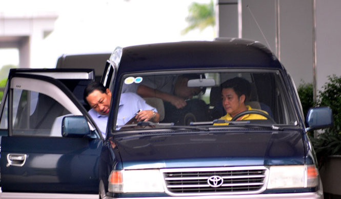 Ông Phan Hòa Bình (trái) sau khi làm việc với Cơ quan điều tra Bộ Công an tại trụ sở Ban tổ chức Tỉnh ủy Bà Rịa - Vũng Tàu sáng 3-7