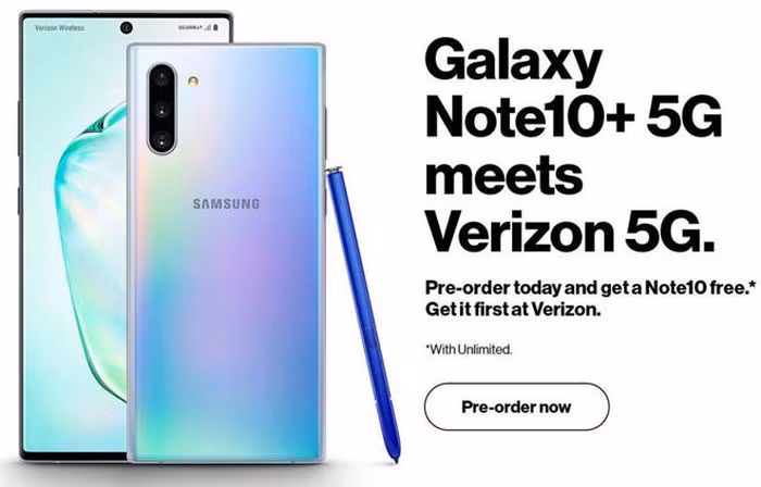 Hình ảnh rò rỉ quảng cáo phiên bản Samsung Galaxy Note10+ 5G trên trang web của Verizon. Ảnh: evleaks.